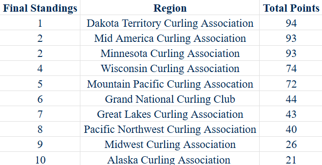 If regions are tied after all four events, the cumulative Win-Loss records will be compared to break the tie. If a tie still remains, it will be broken by the head-to-head record between the regions. If a tie still remains, it will be broken by the cumulative Draw Shot Challenge scores across all four championionships
