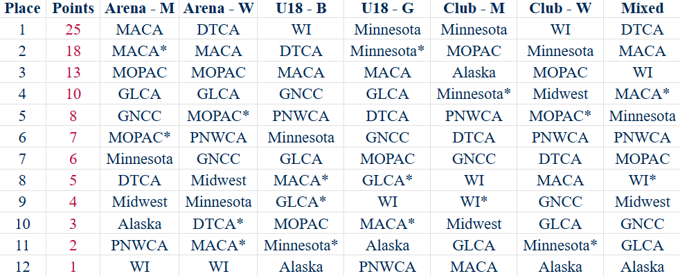 If a region has two representatives because of the fill policy for the event or defending champion status (Arena Club Nationals), only the points earned by the highest ranked team are counted. The placement of every team remains, but no second set of points are allotted if another team from the same region has finished higher.